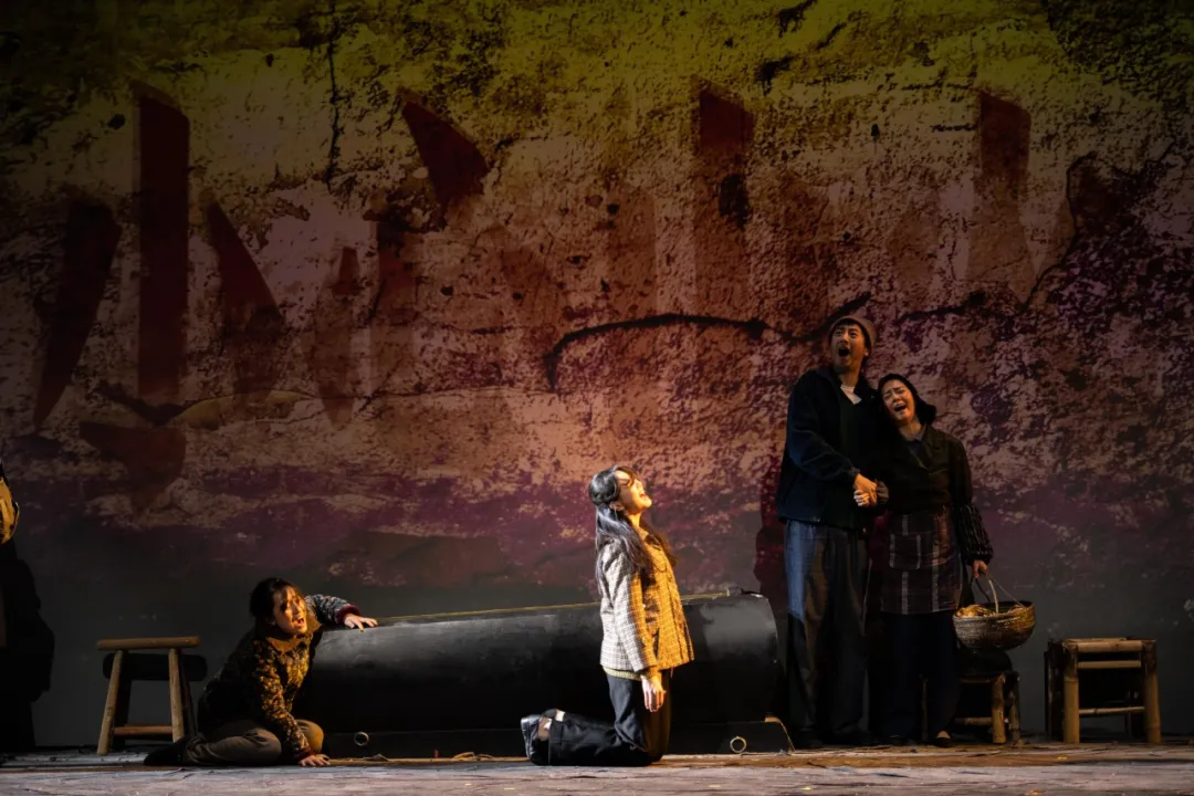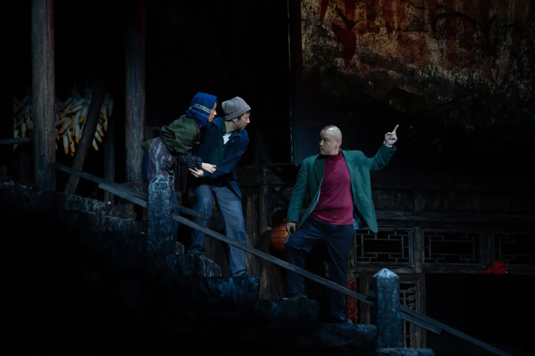 这座12米高、带有转台的贵州吊脚楼,以干阑式木架结构为主要建筑,运用中国古建筑的立柱和梁架结构增加支撑点,减轻布景重量,帮助转台的运作。整栋吊脚楼共有七个不同的空间,以建筑中心区域的回字形楼梯连接,演员通过楼梯穿梭于不同房间演绎不同的故事,环环相扣。