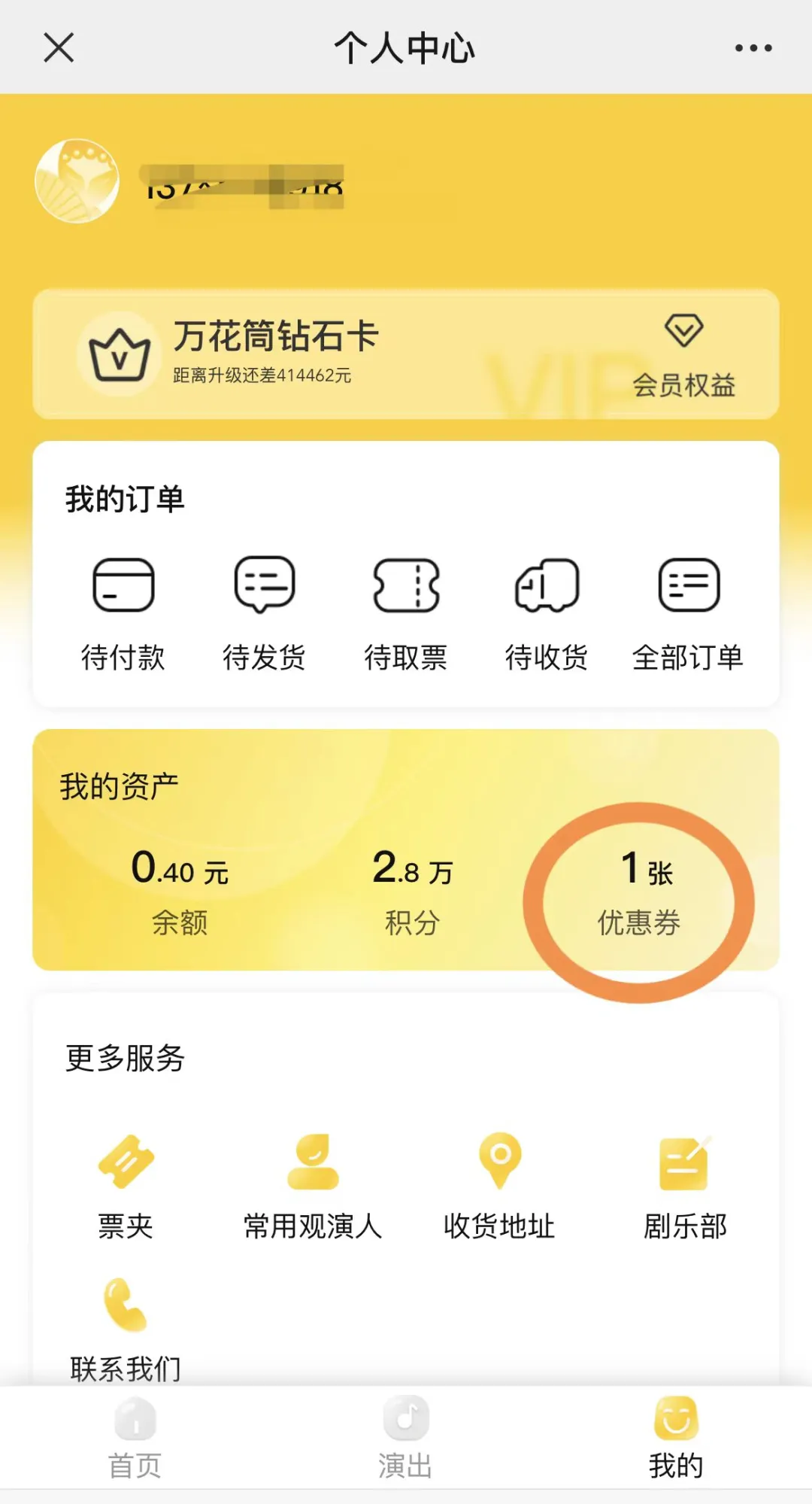 点击公众号下方“在线购票”进入在线购票页面,点击“我的”—“优惠券”,即可查看已有优惠券并使用。