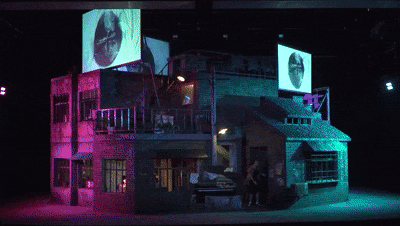 三层居民楼从舞台上拔地而起,破旧的小卖部、晚上阴森的逼仄小巷,闪烁的霓虹灯、破碎的张贴画,分分钟带你穿越至上世纪末的山城重庆。