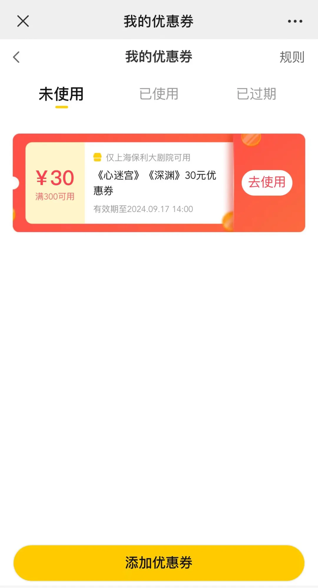 曾购买上保站《心迷宫》或上保站《深渊》观众,系统将自动发放30元优惠券至个人账户,可在购买(〖深渊剧场〗悬疑剧《心迷宫》&〖深渊剧场〗原创悬疑剧《深渊》)时进行抵扣,满300元可用。