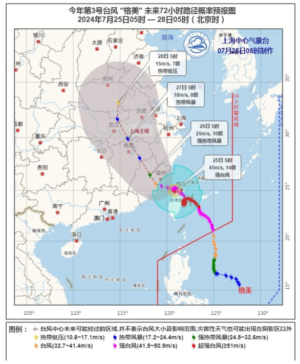 今年第3号台风“格美”(强台风级)已于今天(25日)00时前后在台湾省宜兰县南澳乡沿海登陆,登陆时由超强台风级减弱为强台风级,中心附近最大风力有15级(48米/秒),中心最低气压945百帕。今天07时其中心距离上海市偏南方向约690公里,也就是北纬25.1度、东经120.5度,中心附近最大风速14级(45米/秒),中心最低气压950百帕,七级风圈半径200-330公里,十级风圈半径70公里。