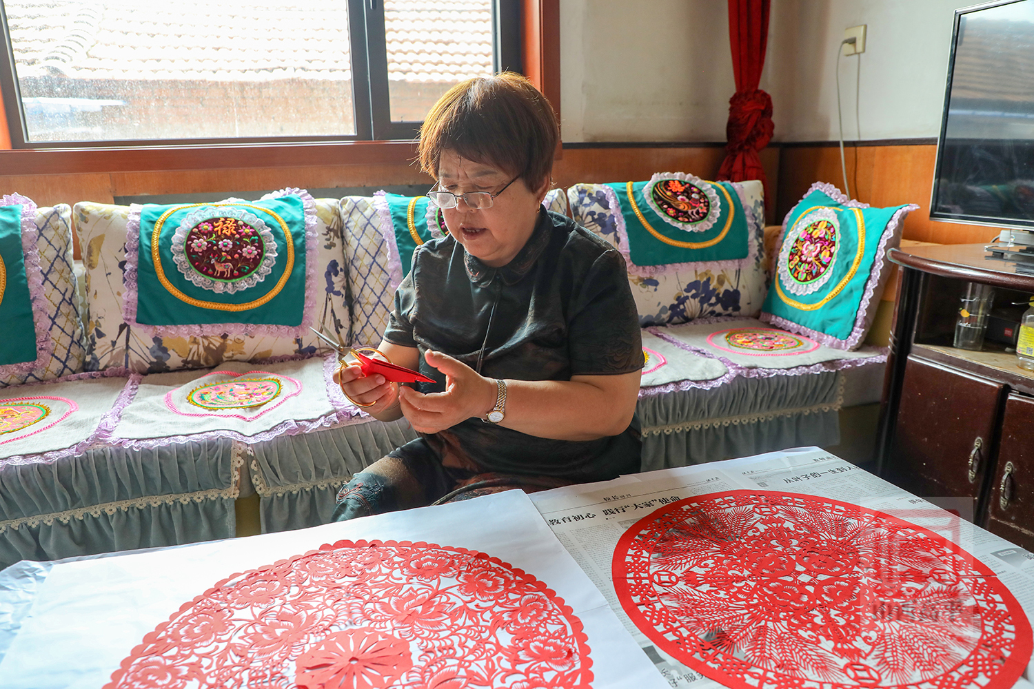来到罗继兰家中,只见她戴着老花镜,一手拿着红色宣纸,一手拿着剪刀,巧手翻飞,专心创作。不一会儿工夫,一幅灵动的“八一”建军节主题剪纸作品便呈现在了我们面前。