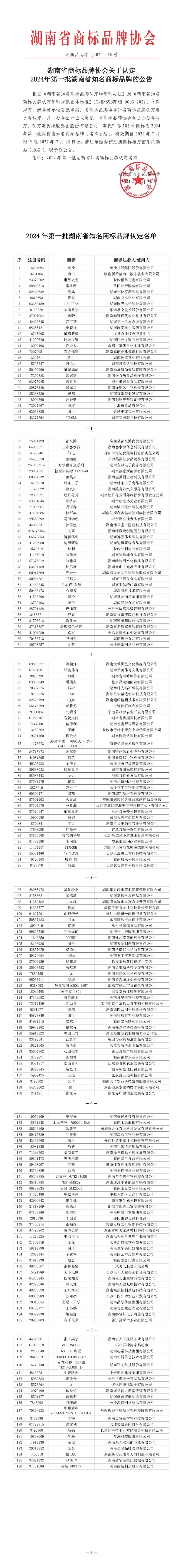 2024年第一批湖南省知名商标品牌认定名单