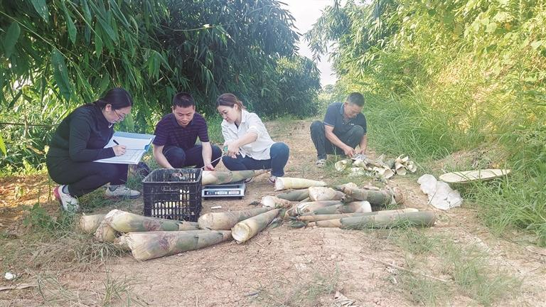 近日,鹿寨县林业局组织技术人员到鹿寨镇石路村新建屯麻竹造林示范林开展竹笋产量监测工作。