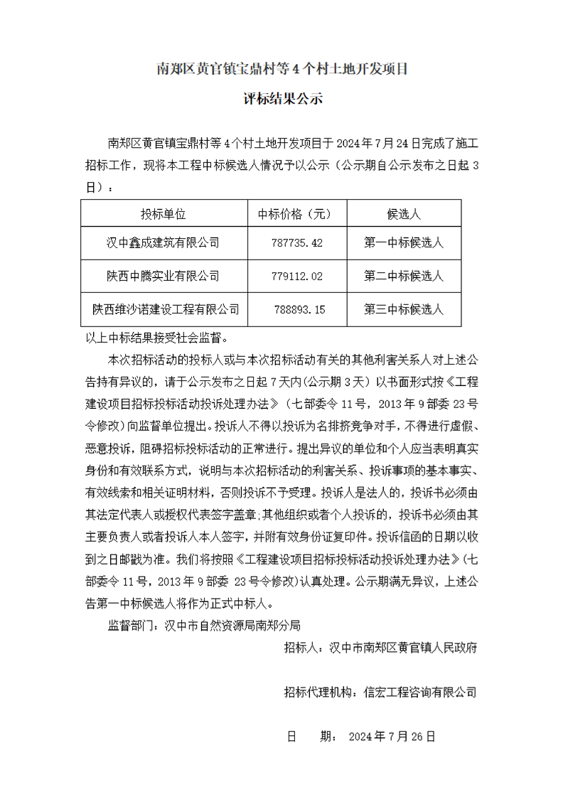 南郑区黄官镇宝鼎村等4个村土地开发项目评标结果公示