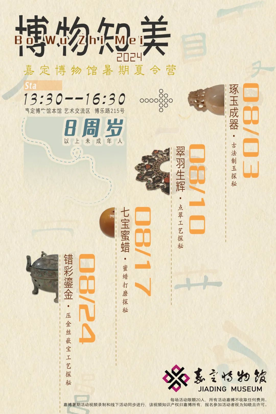 馆藏万物,博物致知。为进一步弘扬中华优秀传统文化,丰富青少年暑期生活,激发青少年对美的感知力与创造力,嘉定博物馆深入挖掘馆藏资源,开展4期“博物知美”暑期夏令营活动。