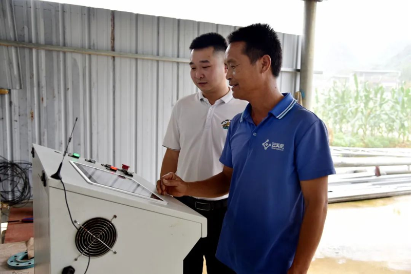 平山镇芝山村斑鸠屯智能水肥一体化基地管理员陶昌贵说:“原来我们种糖料蔗施肥很累,都是看天气来做,看天吃饭,现在有这个设备好轻松,我一个人在这里操作,一个人放肥,一天可以放几百亩,我们这个基地近千亩,我两天就全部放完肥了。”