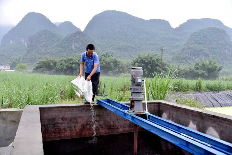 陶昌贵是基地管理员,眼下正是糖料蔗生长的关键期,只见他有条不紊地往蓄水池里倒肥料,然后启动机器将肥料搅拌均匀,为下一步的施肥灌溉做准备。陶昌贵表示,有了各种智慧“新农具”的加持,他现在种糖料蔗既可以告别过去的苦和累,每个月还能有4500元的收入,轻松多了。