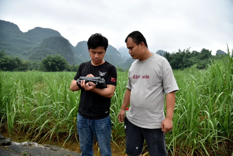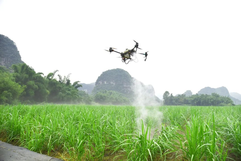 除了智能化施肥、灌溉,在基地里,糖料蔗病虫害统防统治也实现了机械化。只见技术人员操作着植保无人机,伴随着一阵阵螺旋桨的嗡鸣声,无人机沿着糖料蔗地匀速飞行,雾状的农药随着气流均匀地散落在糖料蔗地中,不一会儿,一大片糖料蔗地的病虫害防治作业就完成了。