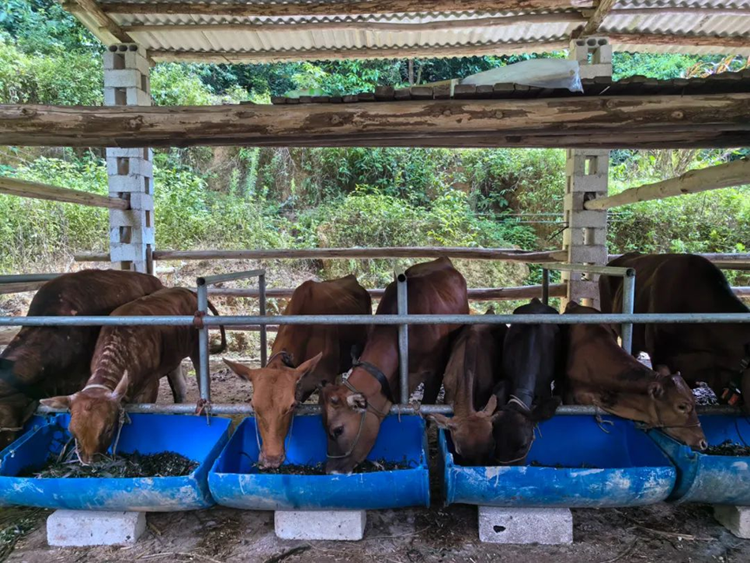 近日,记者沿着蜿蜒的山路而上,来到位于鹿寨县黄冕镇改江村阳坡屯的峦山生态养殖场,只见养殖场里栏舍宽敞整齐,养殖场负责人廖先普正忙着将提前收割好的竹黄草、红象草进行切碎、装筐、投喂。一头头毛色光亮、强健壮硕的牛羊悠闲地吃着它们专属的“营养餐”。
