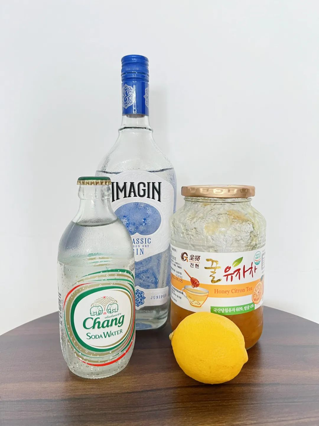 食材:金酒、柠檬、蜂蜜、蜂蜜柚子茶、气泡水、冰块