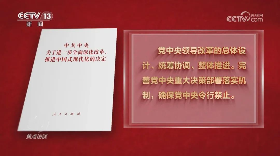 《决定》提出:党中央领导改革的总体设计、统筹协调、整体推进。完善党中央重大决策部署落实机制,确保党中央令行禁止。