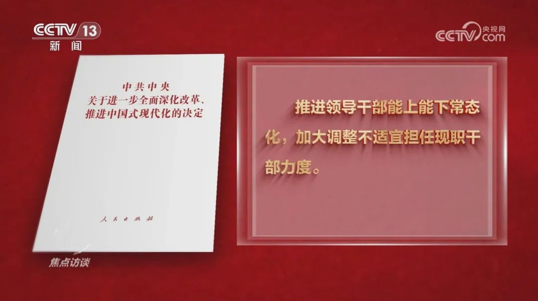 张强:“干部能上不能下,是长期困扰我们的一个老大难问题。党的十八大以来,党中央制定实施《推进领导干部能上能下规定》,在解决这个问题上取得了突破性进展。《决定》进一步强调,要推进领导干部能上能下常态化,加大调整不适宜担任现职干部力度,推动形成能者上、优者奖,庸者下、劣者汰的良好局面。”