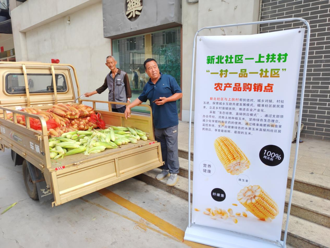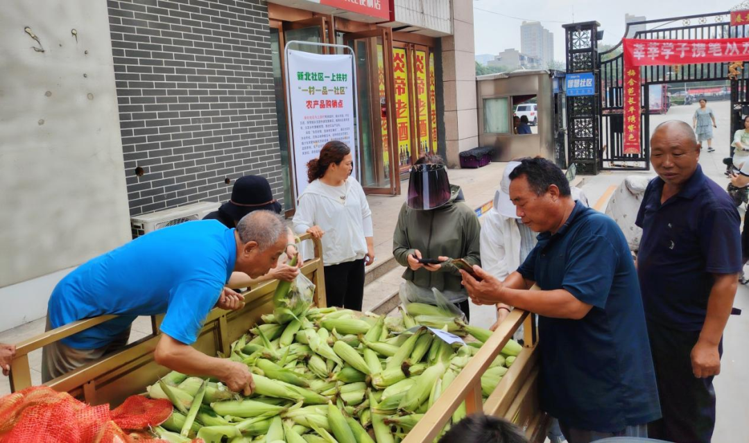 黄澄澄的玉米、绿油油的黄瓜、红彤彤的西红柿……刚过八点半,新北小区大门口,一场特色农产品展销活动正在紧张准备中。