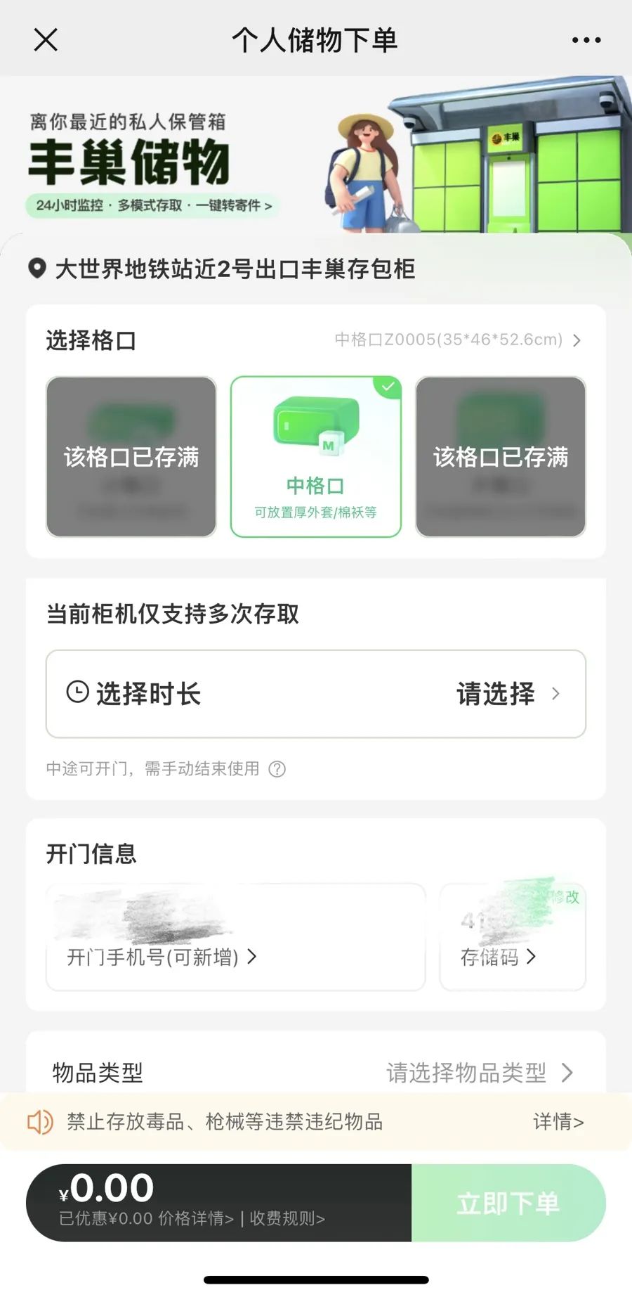 27日9时50分左右,在工作人员指引下,解放日报·上观新闻记者来到大世界站2号口附近的丰巢行李寄存柜处。柜门上张贴有寄存流程以及禁存物品说明。扫描电子屏上的二维码,进入小程序,显示小格已满,还有中格和大格可供选择。因在试点期内,当前存取暂时无需缴纳费用。
