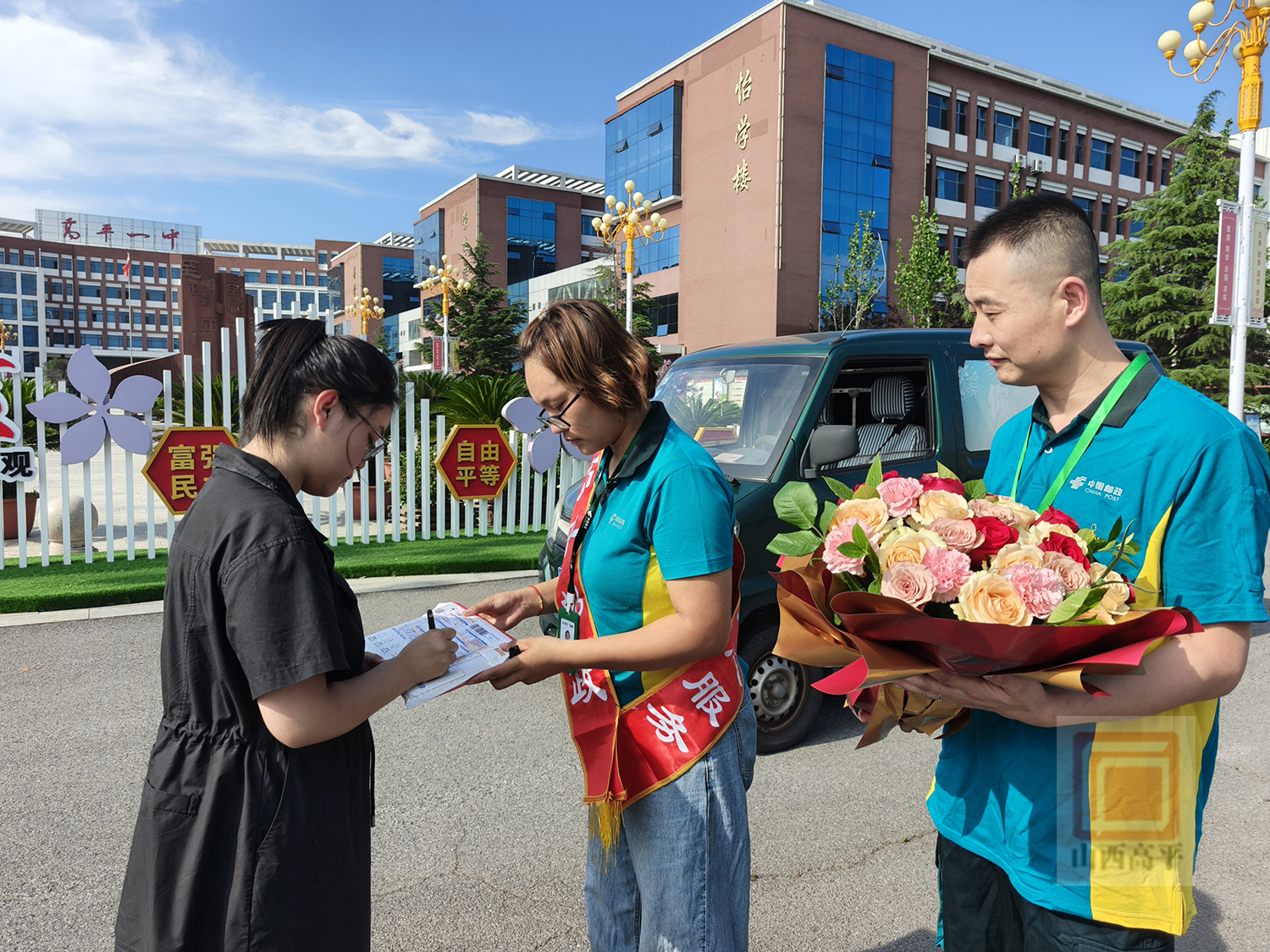 “闫宇萌同学你好,我是高平市邮政分公司投递员,正在为你投递高考录取通知书,请提供一下您的身份证号码和准考证号。”7月27日下午,在高平一中校园内,邮政投递员邵树芳在核验了考生的身份信息后,将北京大学录取通知书郑重地交到了考生手上,并送上鲜花表示祝贺。
