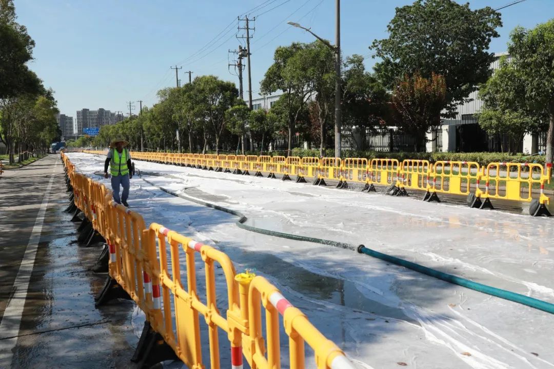 施工现场,工人们正在对路面进行混凝土养护作业,给刚刚浇筑的混凝土“降温”。“洒水是为了使混凝土里的水泥充分水化,有利于混凝土早期收缩裂缝从而保证强度。”施工现场负责人沈洪亮介绍,工程将针对原有的水泥路面结构进行翻挖新建、浇筑钢筋混凝土、加铺沥青面层、恢复标识标线等,施工采用分段、分幅方式推进,以缩短占道时间,减少对周边企业的生产经营活动的影响。