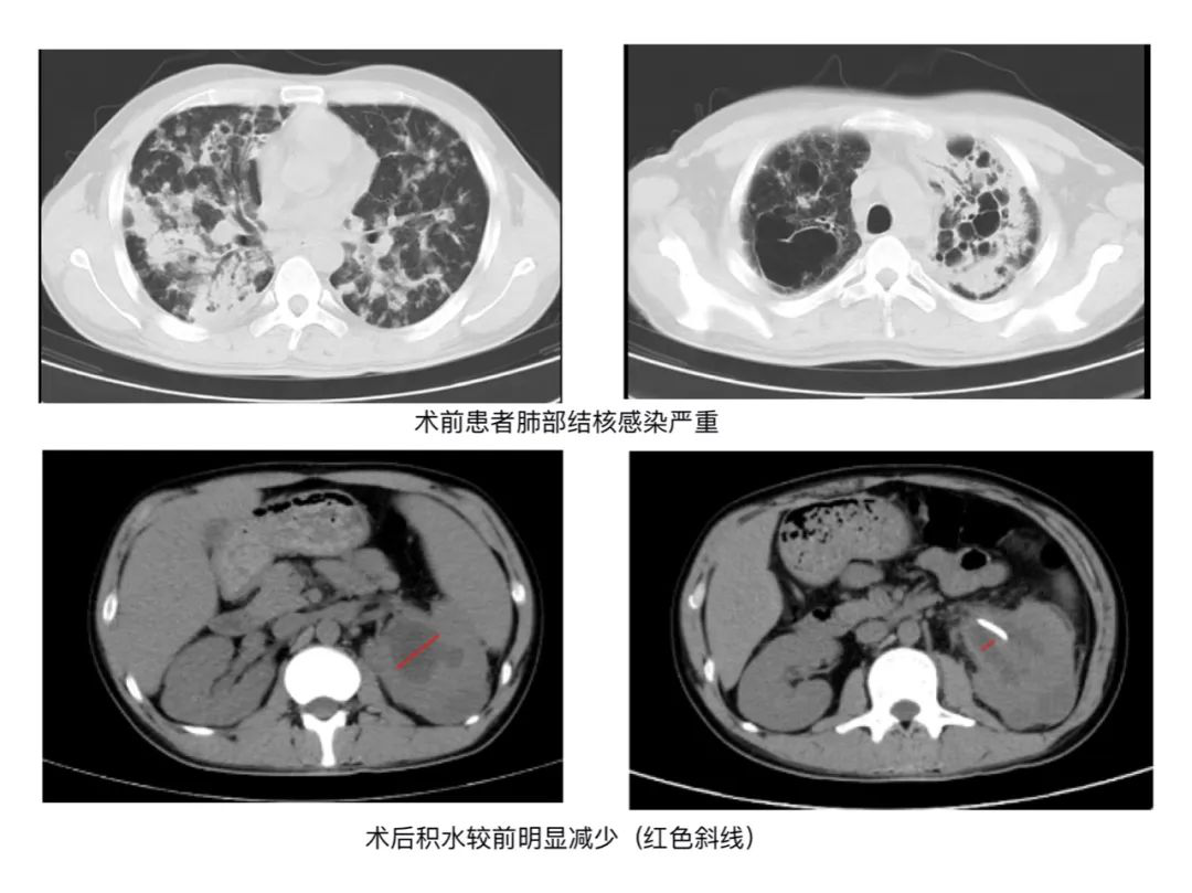 术后,患者来院时的腰疼及发热症状消失。复查后,CT提示积水已经有了明显减少。在经过抗感染治疗后,患者顺利康复出院。
