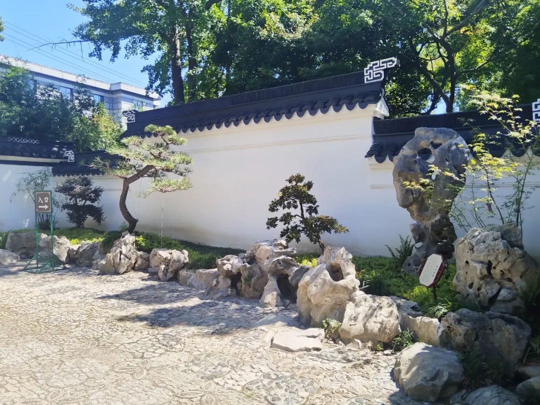 从古猗园北门进入便可到达老正门区域,首先映入眼帘的是位于照壁之前“松石迎客”区。照壁中央的黑松枝繁叶茂,向一侧伸展,宛如一位热情的东道主,伸出臂膀欢迎远道而来的宾客。角落的白皮松高大挺拔,高挑出墙,有凌云之志。驳石花坛右侧,湖石玲珑剔透,如谦谦君子低语诉说着古猗园的历史与传说。整个景点充满了古朴与大气之美,令人不禁驻足。