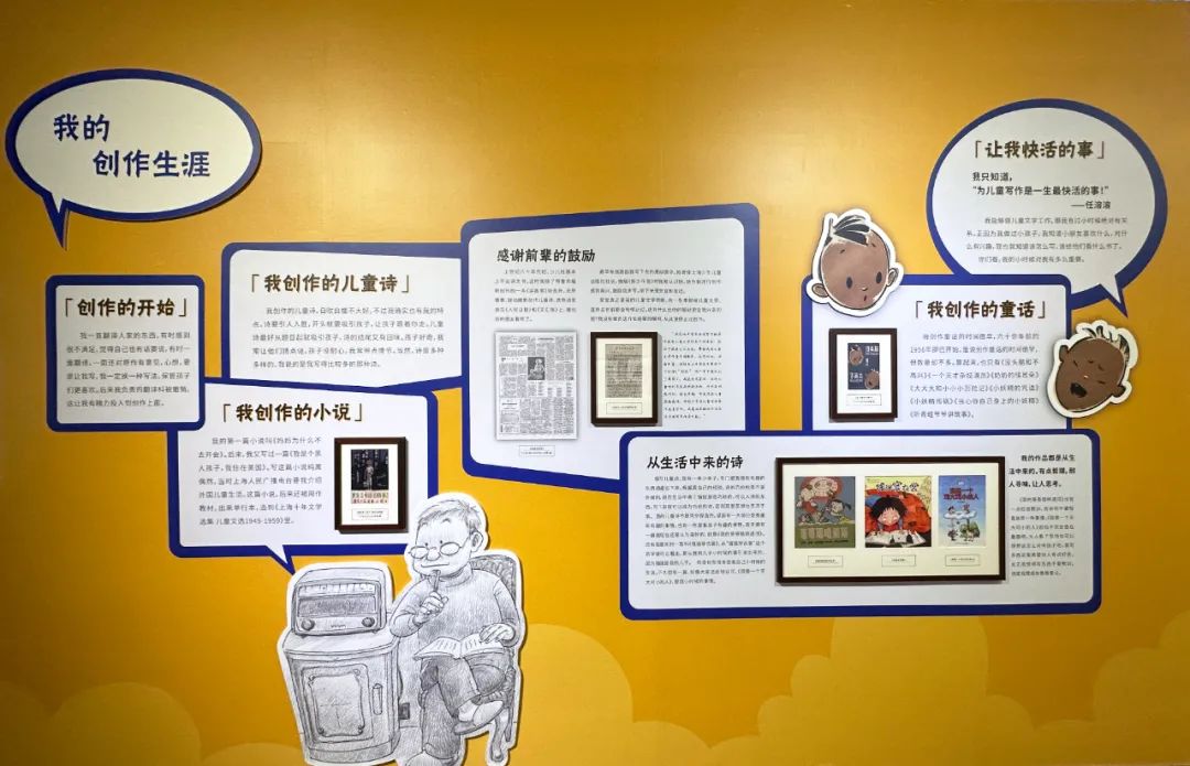 除了翻译儿童文学经典,任溶溶也创作了不少儿童诗、小说、童话故事等。“我一直翻译人家的东西,有时感到很不满足,觉得自己也有话要说。”在“我的创作生涯”篇章,任溶溶吐露自己为何开始创作的缘由,“正因为我做过小孩子,我知道小朋友喜欢什么,对什么有兴趣,我也就知道该怎么写,该给他们看什么书了。我的作品都是从生活中来的,有点哲理,耐人寻味,让人思考。”