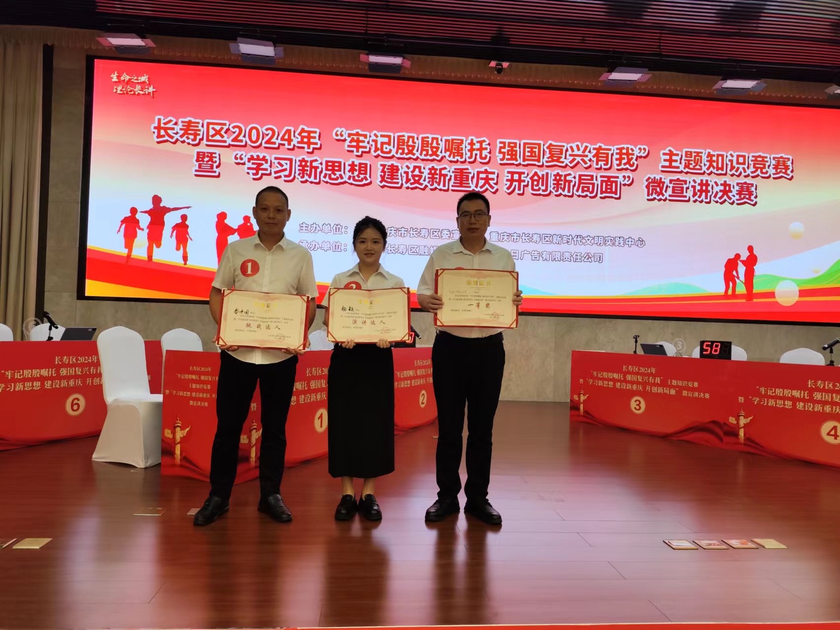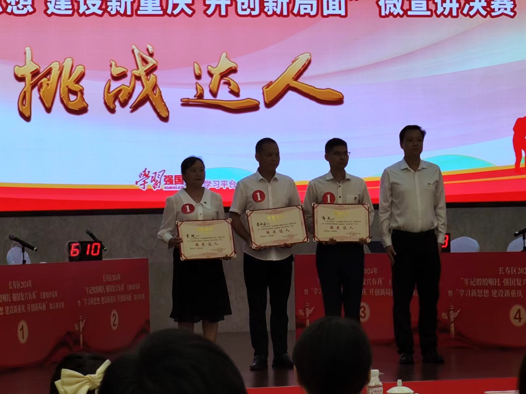 双龙镇在长寿区2024年“牢记殷殷嘱托 强国复兴有我 主题知识竞赛 暨“学习新思想建设新重庆开创新局面” 微宣讲决赛中,荣获单项挑战达人、演讲达人,团体第一名一等奖。