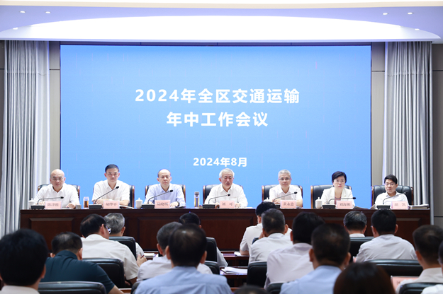 南宁讯(唐梦琳?李雪芝?通讯员?蒋美军?摄影报道)8月3日,自治区交通运输厅在南宁召开2024年全区交通运输年中工作会议,深入学习贯彻党的二十大和二十届二中、三中全会精神,深入贯彻落实习近平总书记关于广西工作论述的重要要求和关于交通强国的重要论述,认真贯彻落实自治区党委十二届八次全会、全区年中工作会议和交通运输部2024年半年工作会议决策部署,总结上半年工作,分析当前形势,部署下半年工作。自治区交通运输厅党组书记、厅长,自治区铁路建设办公室主任刘可出席会议并讲话;自治区交通运输厅党组成员、副厅长黄永忠主持会议。