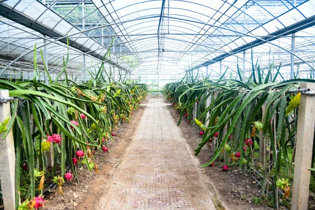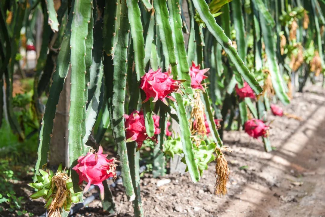 走进宏泰园的红心火龙果大棚,一排排带刺的绿色藤条末端结着沉甸甸的果实,鲜红的色彩煞是喜人。
