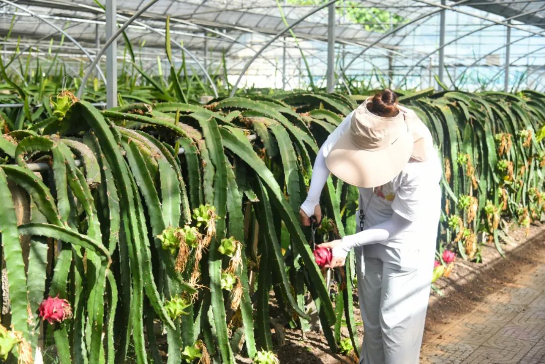 “没想到火龙果的‘真身’是这样的,看着像仙人掌的藤却结出了果实,感觉好神奇,自采确实有趣。”市民陈女士仔细寻觅成熟的果实,随后用剪刀剪下。“这些拎起来分量不轻,肯定水分充足。”陈女士向小嘉展示“战绩”。