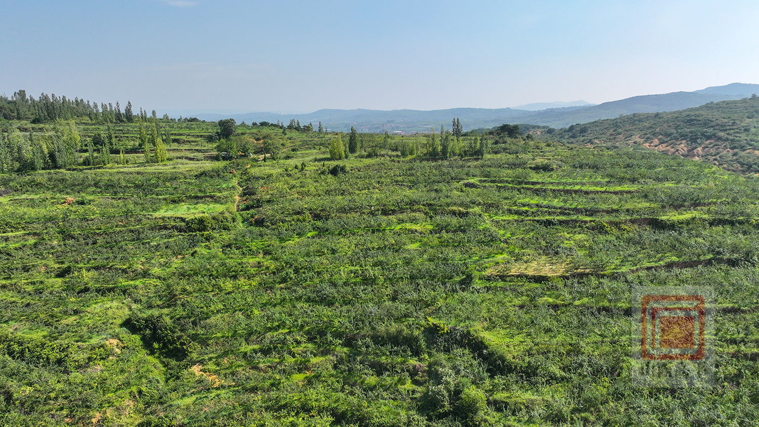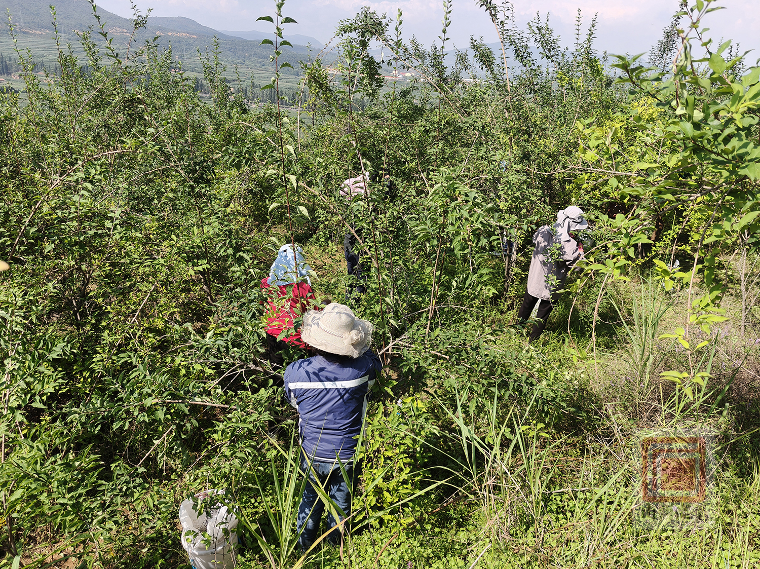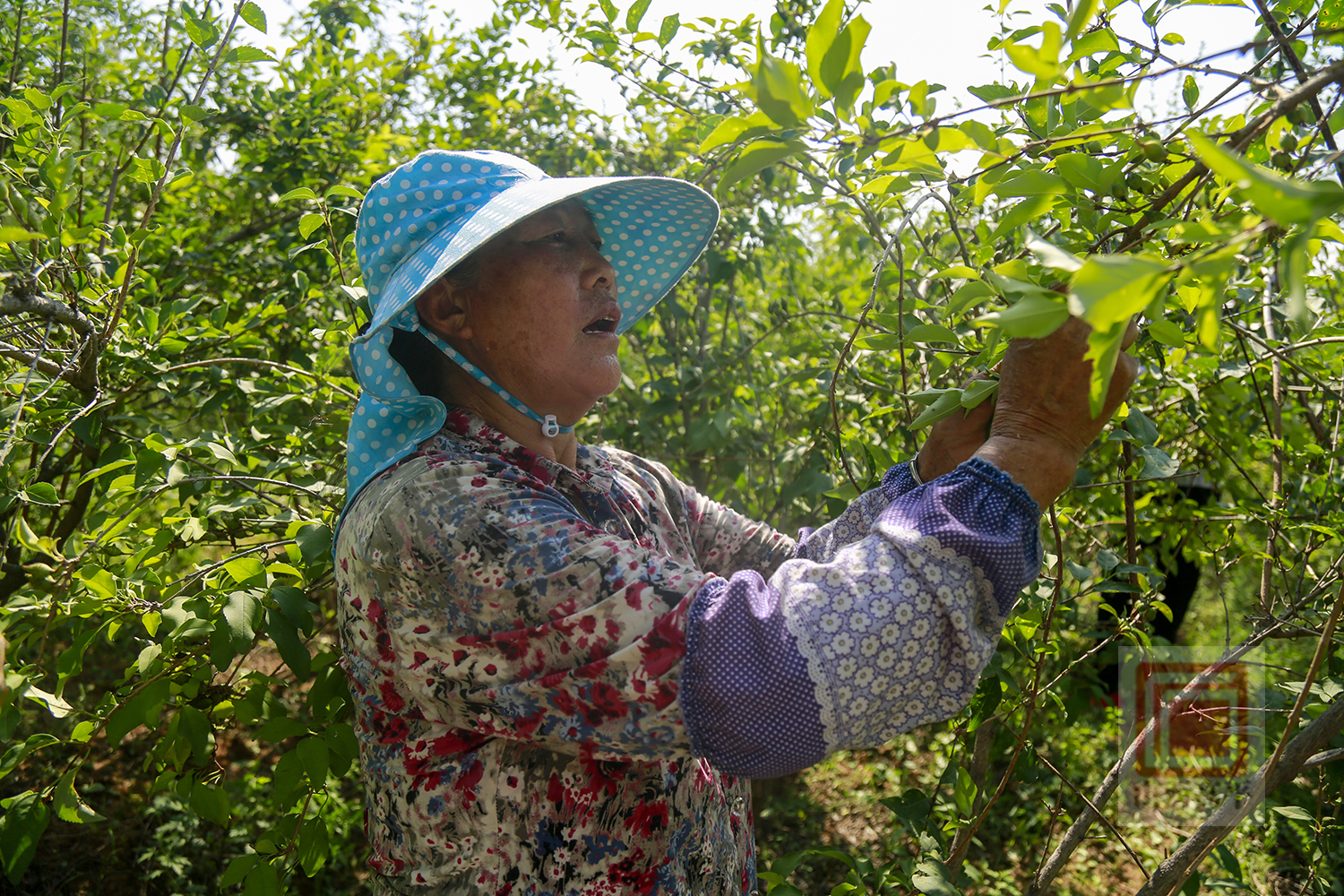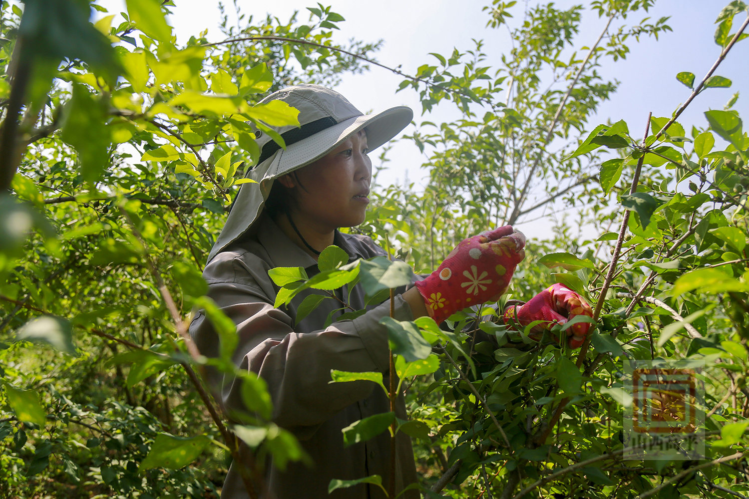 来到连翘种植基地,漫山遍野的连翘郁郁葱葱,青翠的绿叶间一颗颗连翘果缀满枝头、果实饱满。山坡上人头攒动,村民们头戴帽子,做好防晒,克服高温天气,穿梭在一株株连翘间,娴熟地采摘着连翘果。