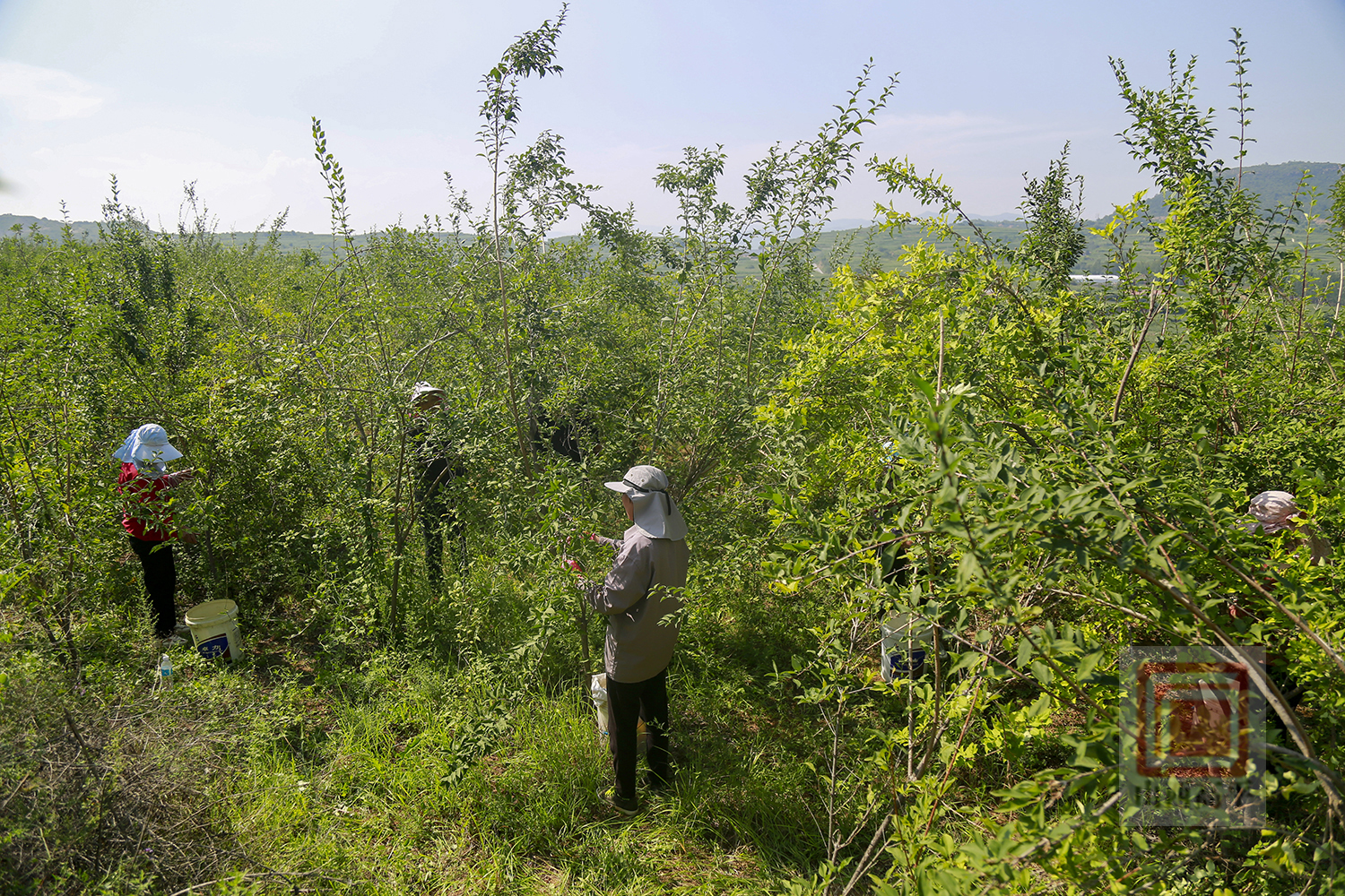 村民王桂花一边摘连翘果,一边笑着说:“今天是我来采收的第4天,平均每天能采20斤左右。这里是按斤计工,采得多挣得就多,大概还有两个月的时间才能采摘完,趁着农闲,给家里增加些收入。”