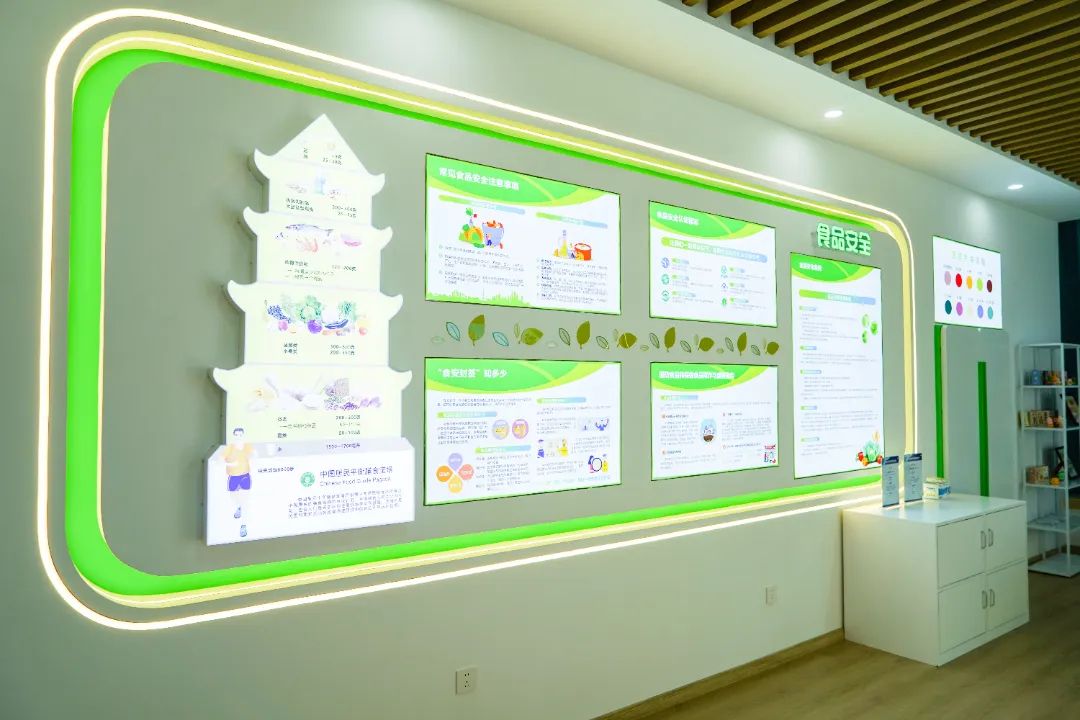 首先,在科普站右侧设有咨询服务台,左侧起始为膳食营养知识塔和食品安全知识展示区。紧接着是快检台,市民可在此参与食品快速检测操作。针对食品中瘦肉精、蔬菜农残的检测项目,展示了检测所需器材、试剂、检测方法、步骤和判断标准,让市民可以了解并重视食品安全的重要性。随后映入眼帘的是“食品知识冰箱”,其侧面展示了日常家用食品冰箱的存储知识,上方标注了食品保存期限。冰箱内部设计了食品磁吸贴,供市民进行互动体验,以更直观的方式了解冰箱存放知识。