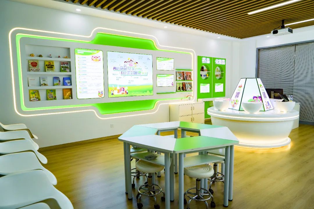 该科普站坐落于陆家片区邻里中心,周边配备有我嘉餐厅、我嘉书房、社区卫生服务站等便民服务设施,为居民提供一站式的生活服务体验。科普站功能完备,包含咨询服务区、展示区、阅读区、互动体验区、食品快检区等多个功能区域。
