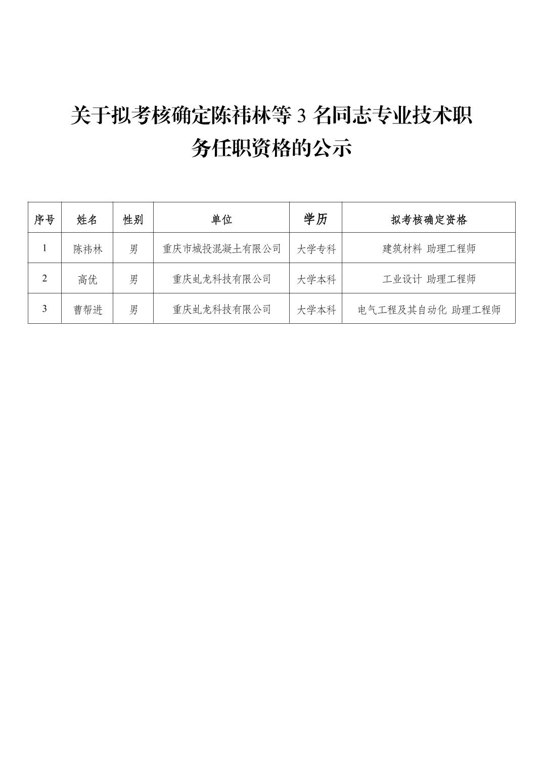 大渡口区职称改革办公室关于拟考核确定陈祎林等3名同志专业技术职务任职资格的公示
