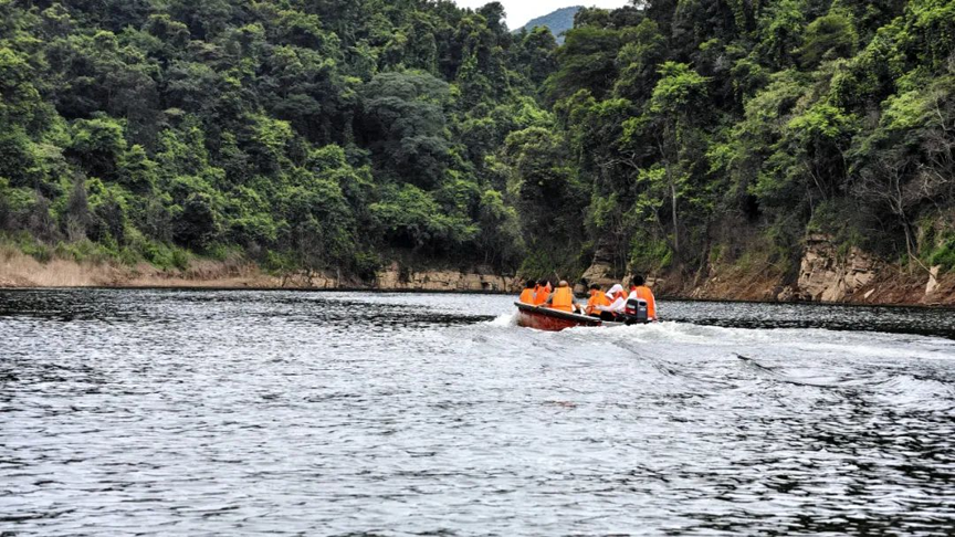 随后,调研组乘坐冲锋舟前往库区上游水面,实地了解库区两岸植被保护、水土保持、道路桥梁等相关工作情况。