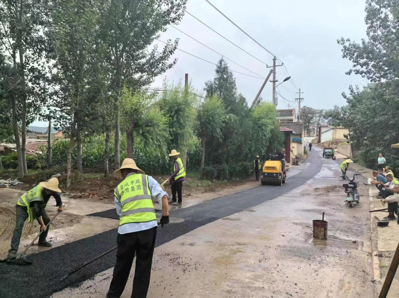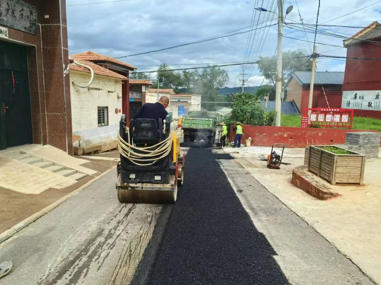近日,走进米山镇吴村村主干道雨污分流改造工程施工现场,只见运料机、沥青摊铺机、压路机齐上阵,施工人员有序施工,正在进行路面恢复铺油作业,呈现出一派热火朝天的繁忙景象。