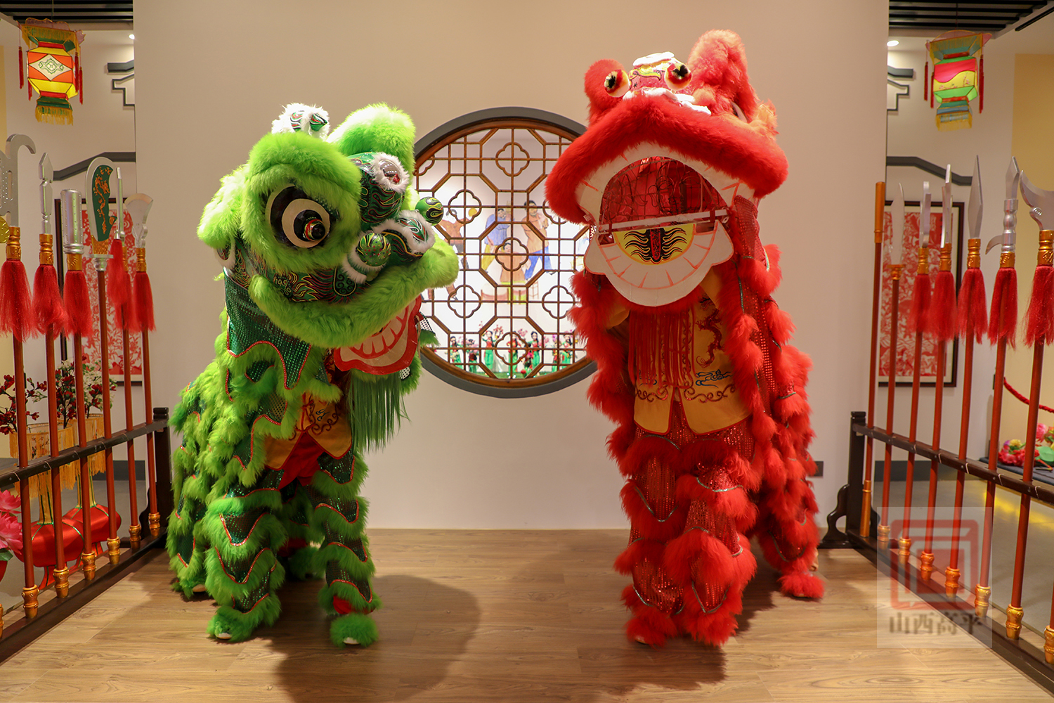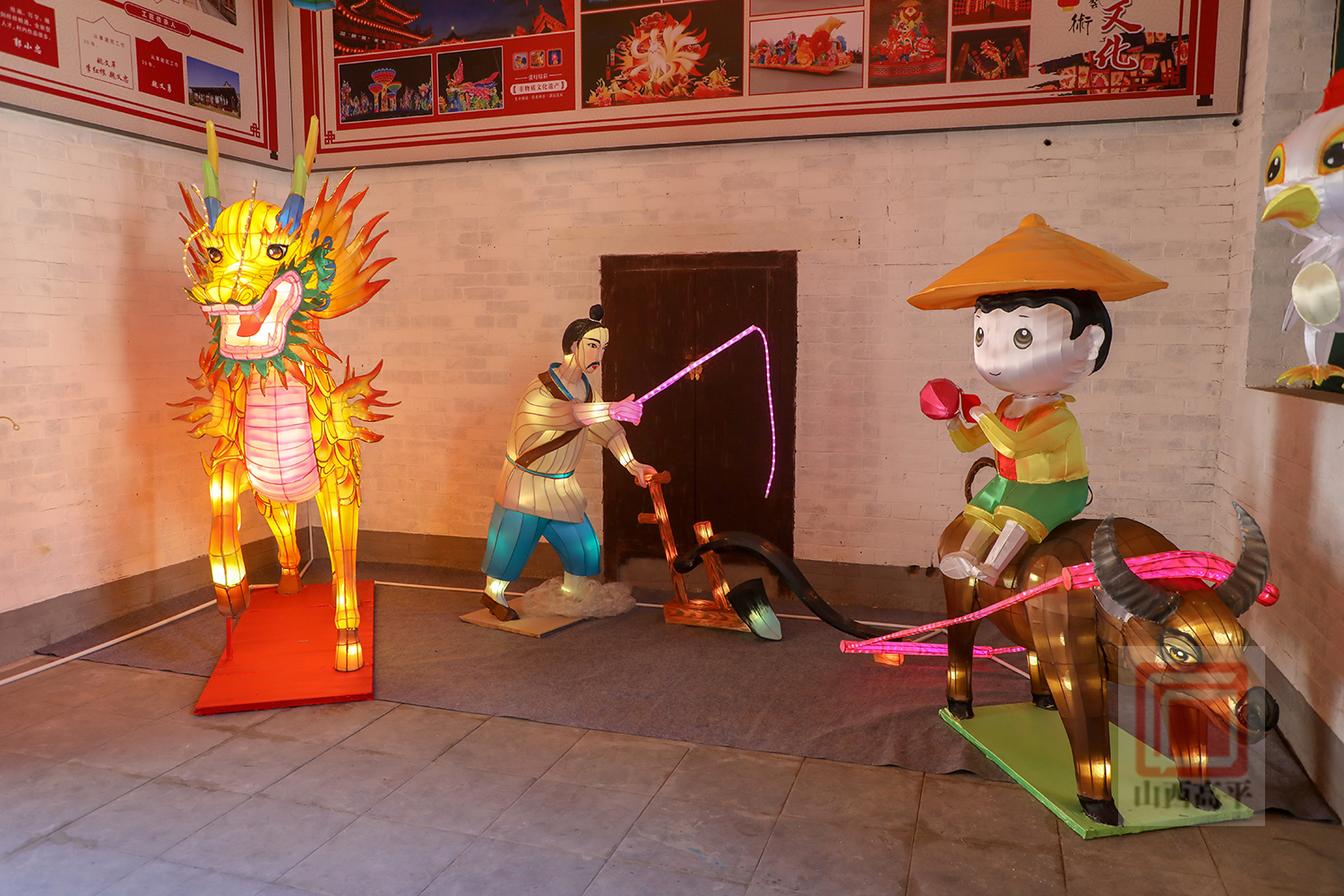 跟随郭孝勇,我们来到藏在古院落中的社火展馆。一进馆内,浓郁的传统文化气息扑面而来,琳琅满目的社火文化元素让人眼前一亮。样式繁多、制作精美的彩灯或挂在屋梁下,或摆放在屋内,让古朴典雅的老房屋充满了灵气。舞龙舞狮、九莲灯、跑旱船、骑竹马等社火表演用的服饰和道具,活灵活现,一一进行了展示。为了让社火文化活起来、火起来,该村还将社火文化与乡村旅游有机融合,推出了一系列社火表演的IP形象,让社火文化生动化、卡通化,激发人们对社火文化的了解与热爱。