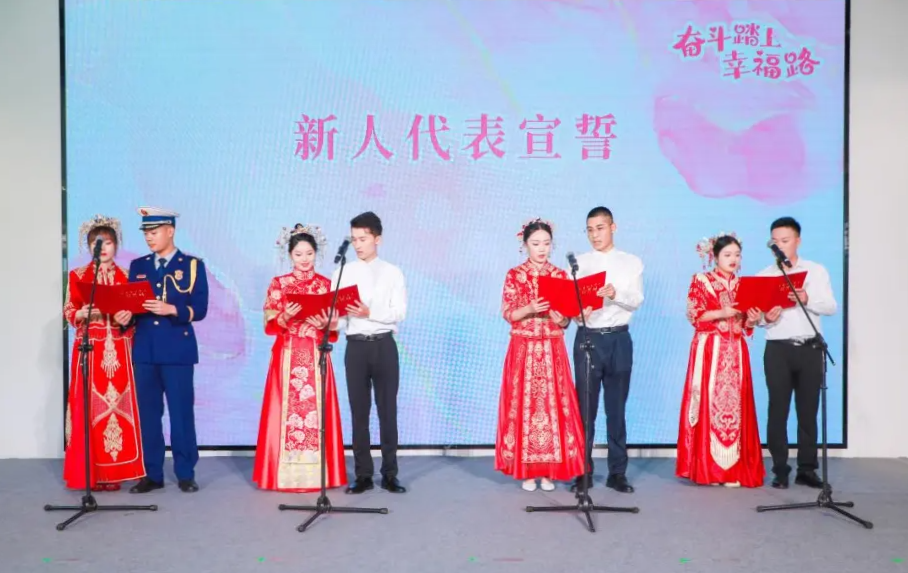 在“真爱定格”环节,来自嘉定工业区企事业单位的四对新人现场宣读誓词,领取结婚证,共同开启人生的新篇章。“我们都在嘉定工作,结婚之后也会在这里生活。”新婚夫妇杨泽曦、赵姝晗说,“希望我们能为嘉定的发展贡献一份力量,在这里安居乐业、幸福生活。”