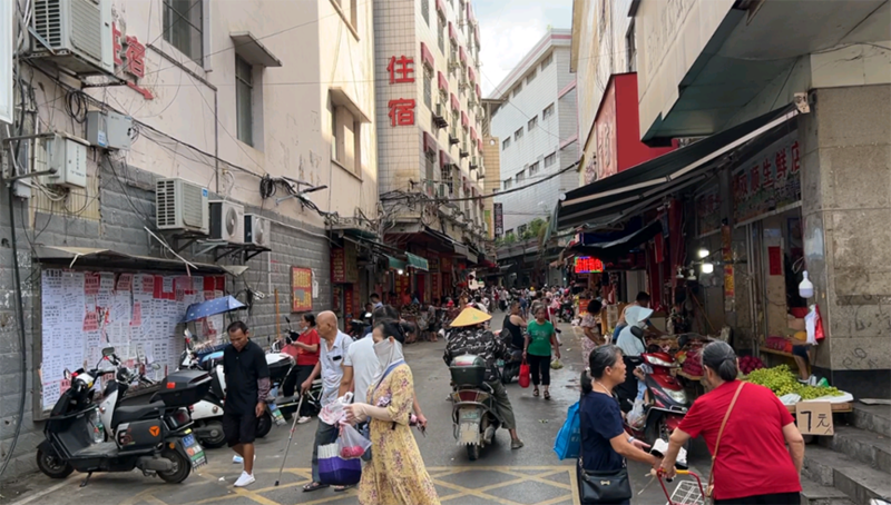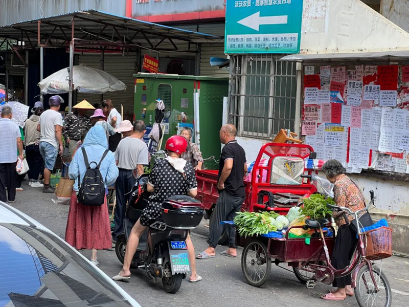 8月8日上午10点左右,记者先后来到县城百鑫商城、鹿寨市场、桂中市场,看到街道两侧的商户基本能够做到店内经营,店外售卖的现象以及流动摊贩比较少见。但由于占道经营的流动性强,不少流动商贩仍存在侥幸心理,选择在人行道、机动车辅助道、小区门口进行经营。在县城南市街路口入口处,记者看到水果流动摊贩存在占道经营的行为。同样,在南闸街鹿寨市场一处入口、建中北路鹿寨市场一处入口,水果、蔬菜摊车摆放在便道上,给过往路人通行带来了不便。