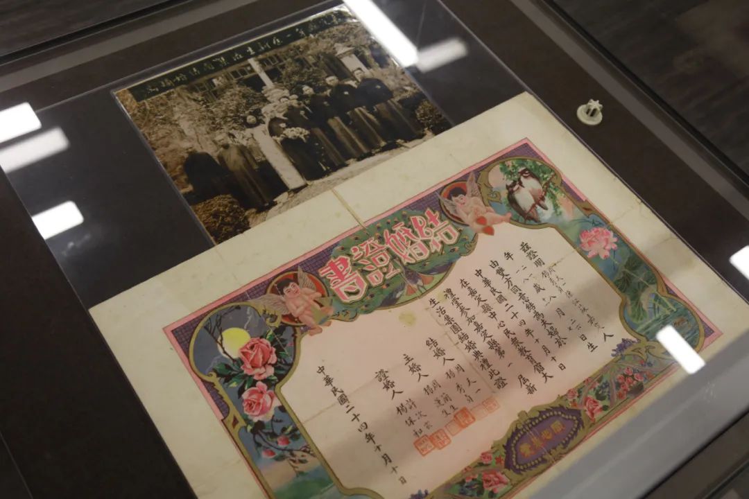 值得一提的是,在嘉定区档案馆三楼的嘉定典藏展中,还展出了另一份同样珍贵的民国婚书——民国二十四年(1935年)周天一与杨秀贞夫妇的结婚证书。这份婚书色彩鲜明、设计巧妙,将花好月圆的传统图案与小天使的西式元素相结合,展现了当时中西文化交融的独特风貌。一旁的结婚照片更是生动地记录了新人的甜蜜瞬间。