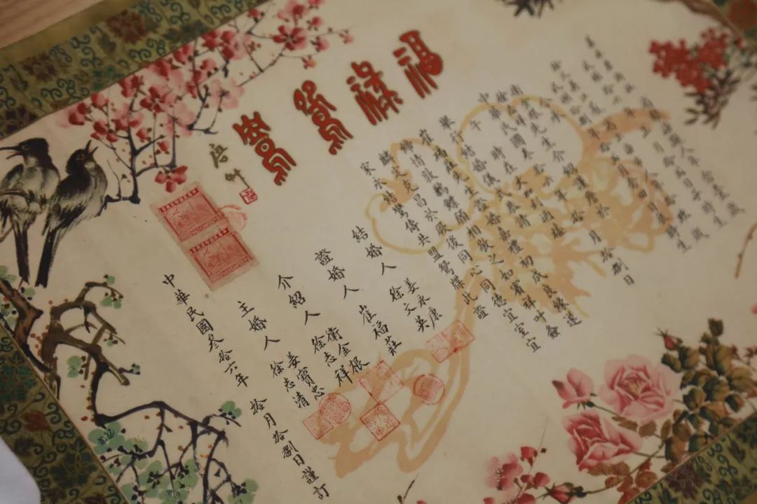 区档案馆征集编研科科长王丽君介绍,这份婚书的左上角是两只喜鹊,取自喜鹊登枝、喜上眉梢的吉祥寓意。其中牡丹吐蕊、红梅高挂、桃之夭夭、其叶蓁蓁,象征着新人婚后的幸福生活,祝福他们将来子孙满堂,其乐融融。