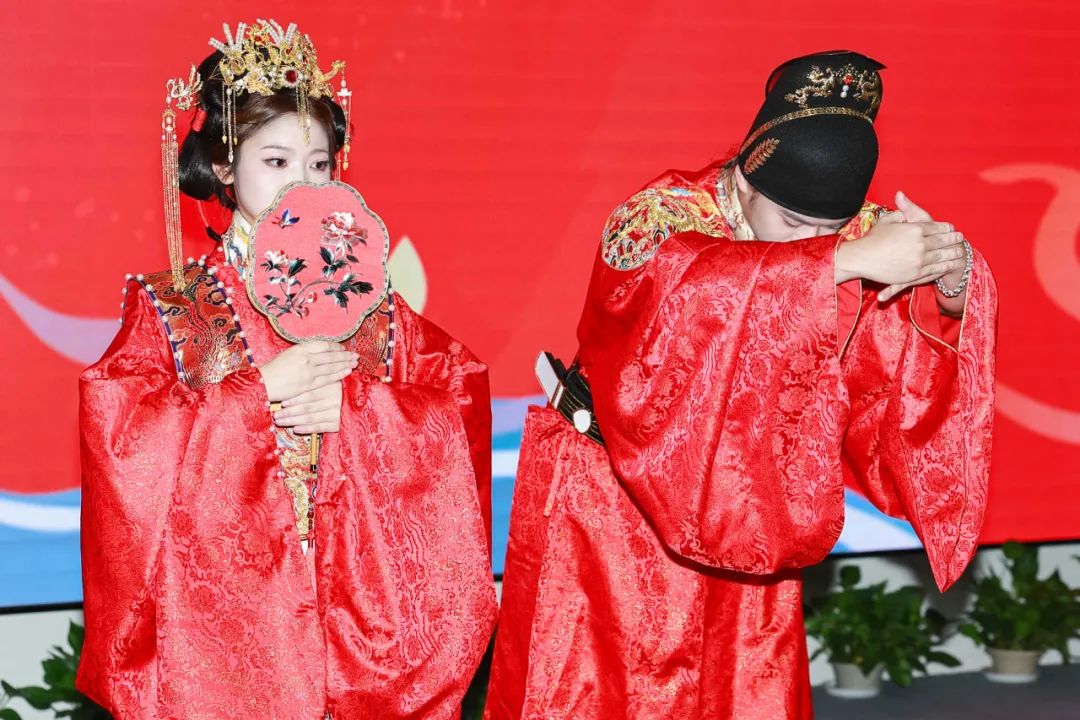 凤冠霞帔、却扇沃盥、结发合卺……一场庄重大气的明制婚礼仪式拉开联谊序幕。观赏完仪式,韩女士十分激动:“我觉得中式婚礼不仅浪漫,还更有底蕴,以后结婚我一定会考虑这个形式。”