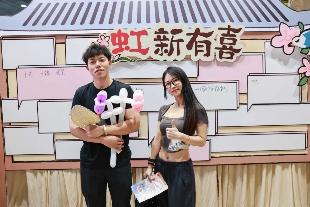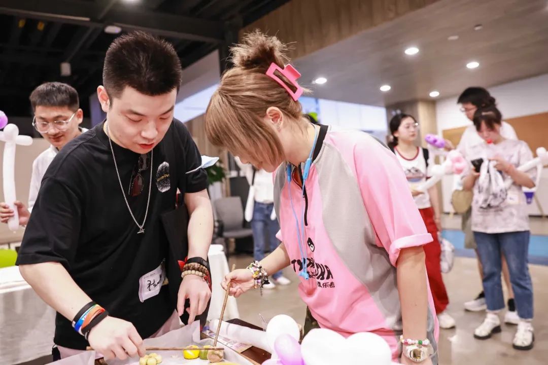 婚礼仪式后才是好戏开场,多个活动点开放游戏挑战,嘉宾们两两一对,跃跃欲试。其中,不少人在“舌尖‘虹’韵”活动点埋头奋战。这个游戏要求两位嘉宾一人一根筷子,合作将巧果运到另一端才算成功,不仅考验双方默契,文明用餐、公筷公勺的理念也巧妙蕴含其中。