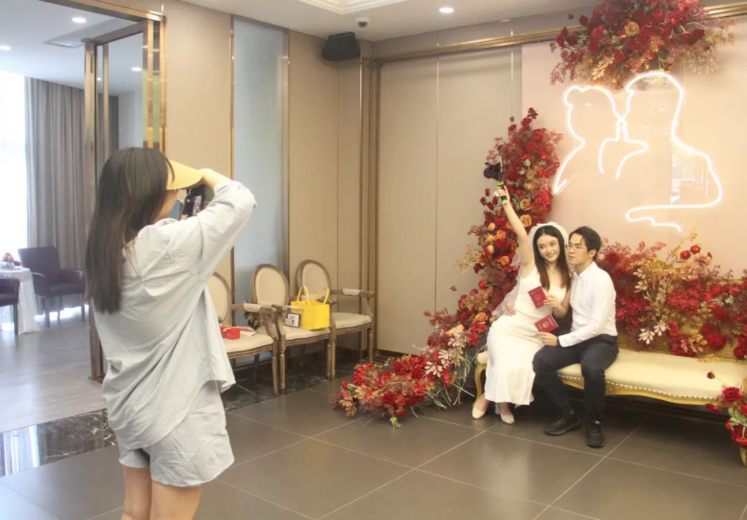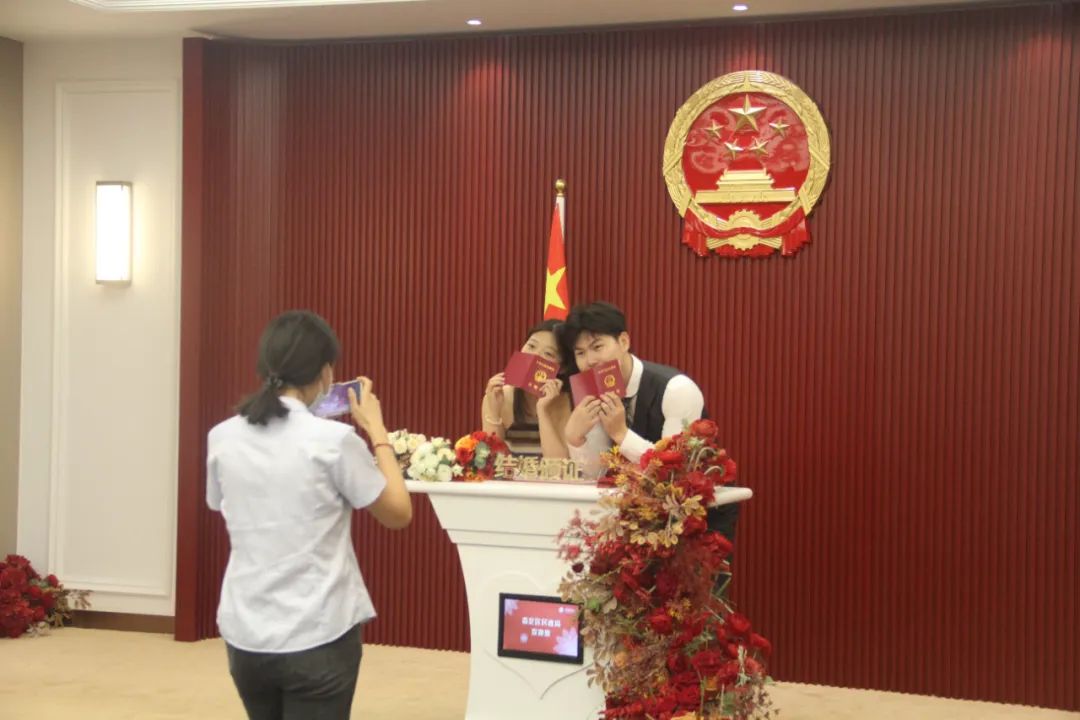 在这个特殊日子,不仅新人精心准备,嘉定婚姻登记管理所也布置了拍照打卡的背景和道具,给领完证的新人赠送玫瑰花。“七夕节,我们也希望能给新人一点小小的仪式感,让这个特殊的日子更加难忘。”嘉定婚姻登记管理所颁证员徐鸯说。