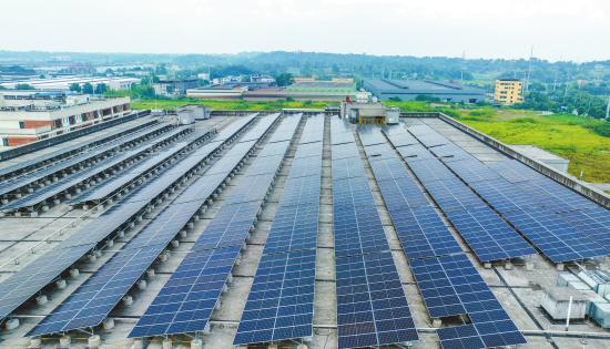 8月4日,航拍下的重庆市双桥经济技术开发区的盛泰光电屋顶光伏发电站,一排排蓝色的光伏板在阳光下源源不断地为企业输送着绿色能源。据了解,该项目由景旦新能源子公司重庆盛泰达投资,项目总投资约590万,充分利用厂房屋顶和车棚建设,装机容量1.4兆瓦,年发电量约119万度电。