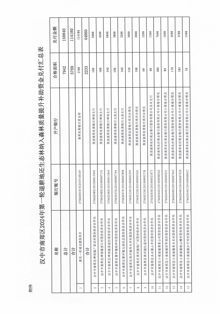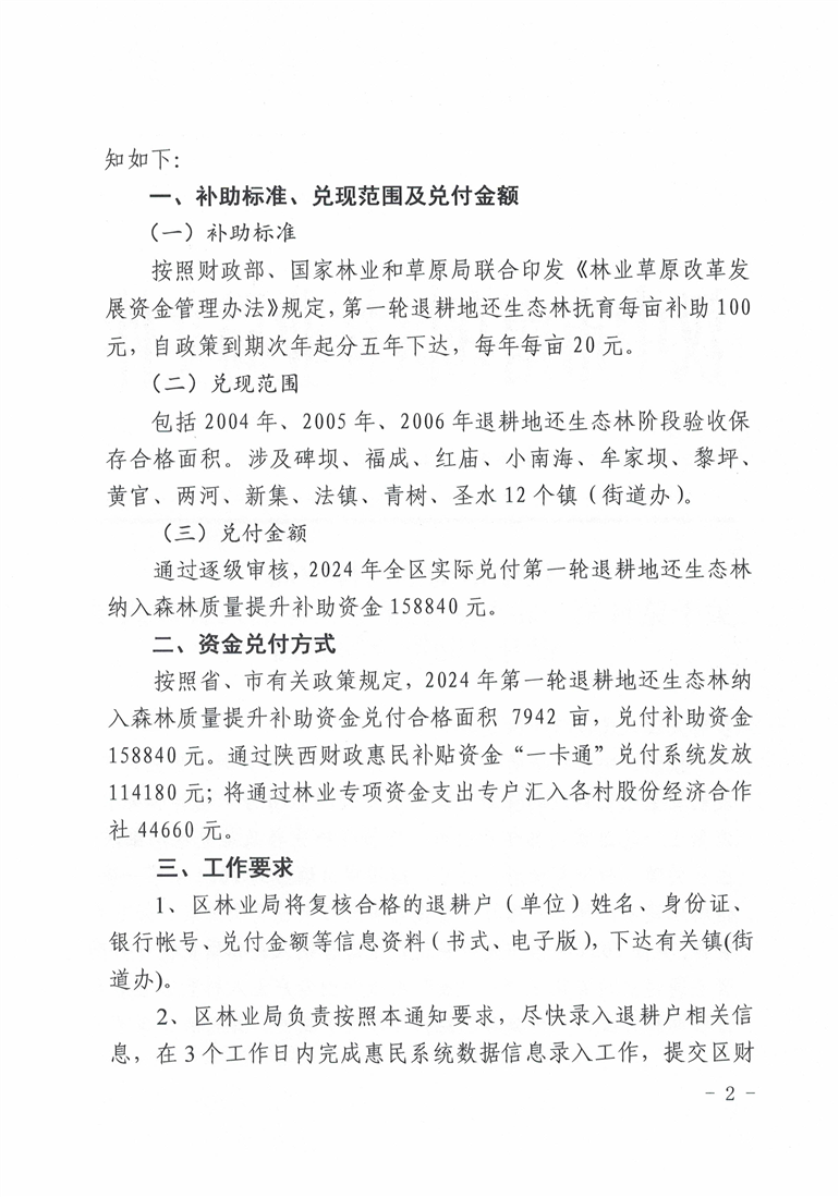 汉中市南郑区林业局关于兑付第一轮退耕地还生态林纳入森林质量提升补助资金的通知