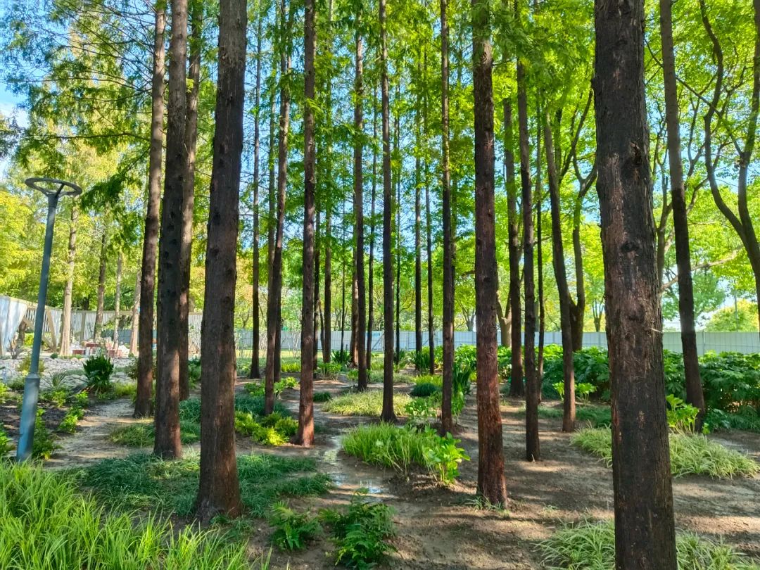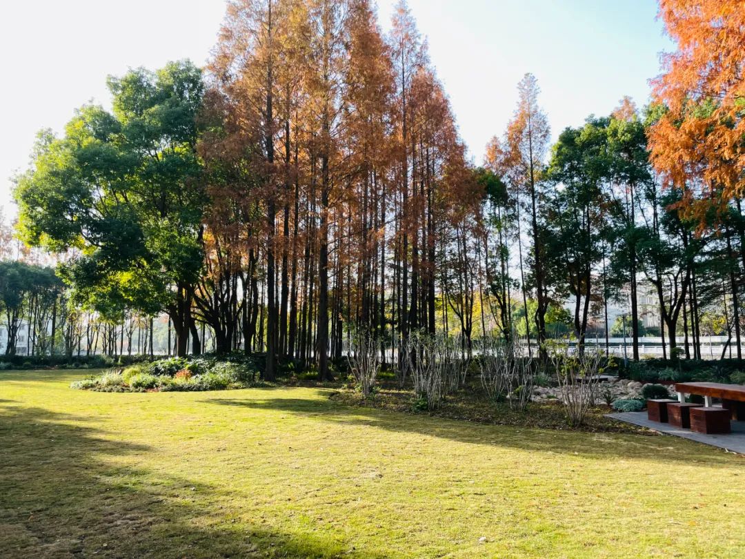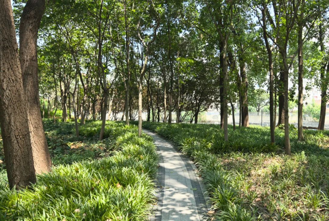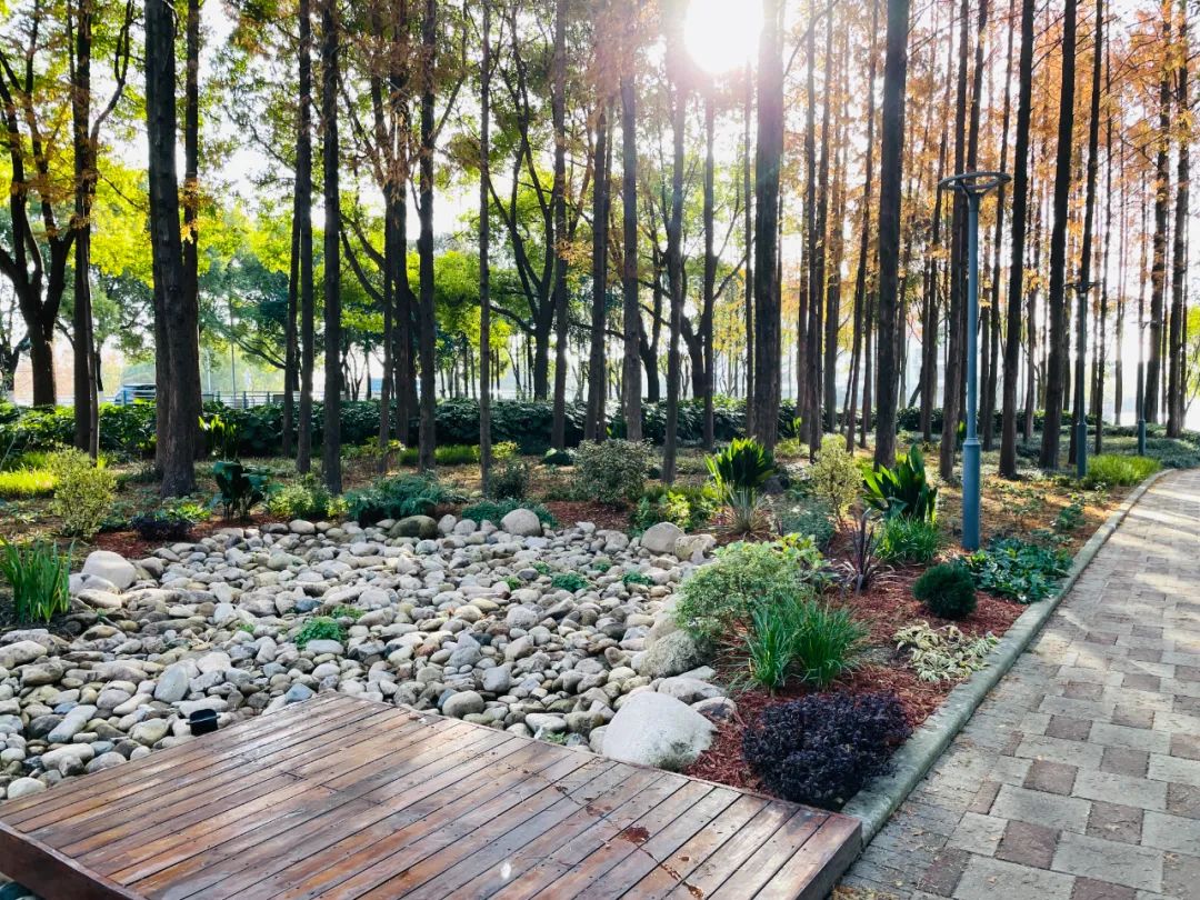 公园外围展现樱花主题,沿两岸滨河区域集中栽植樱花,例如垂枝樱、染井吉野、八重樱等,打造樱花步道、樱花伴亭等景观,形成樱花特色专类园。内场空间自然围合,在绿地中央区域保留原有的水杉,融入雨水花园理念,增设避雨及林下休憩场所,点缀耐荫、耐水湿地被,营造出自然、生态、静谧的怡人港湾。