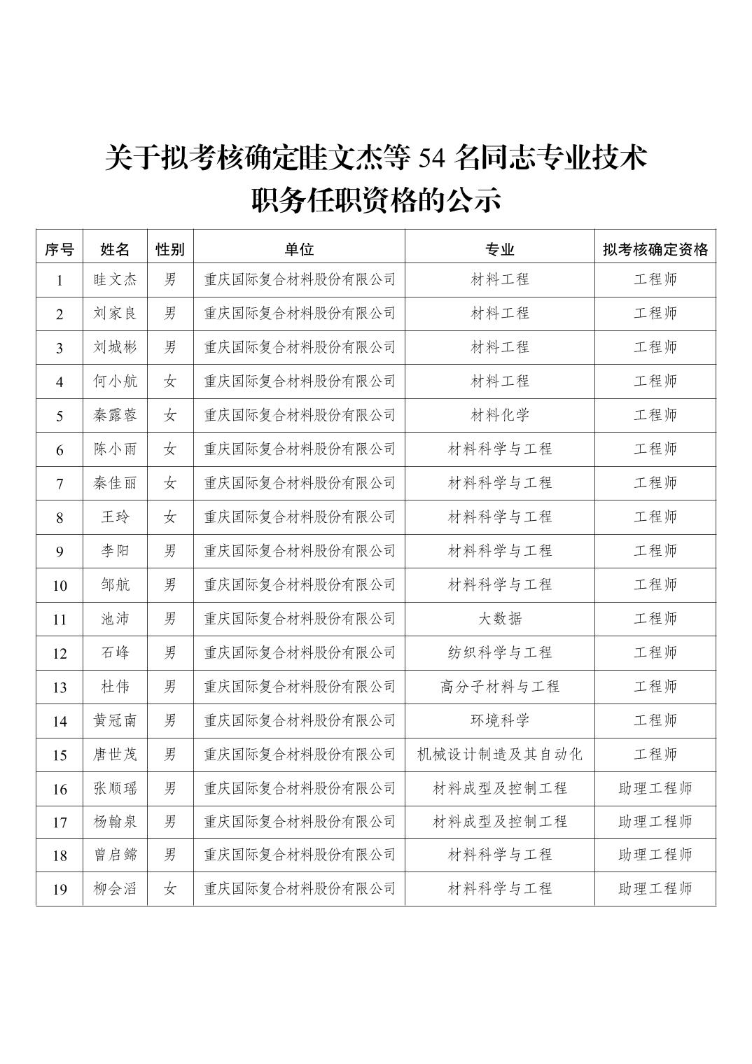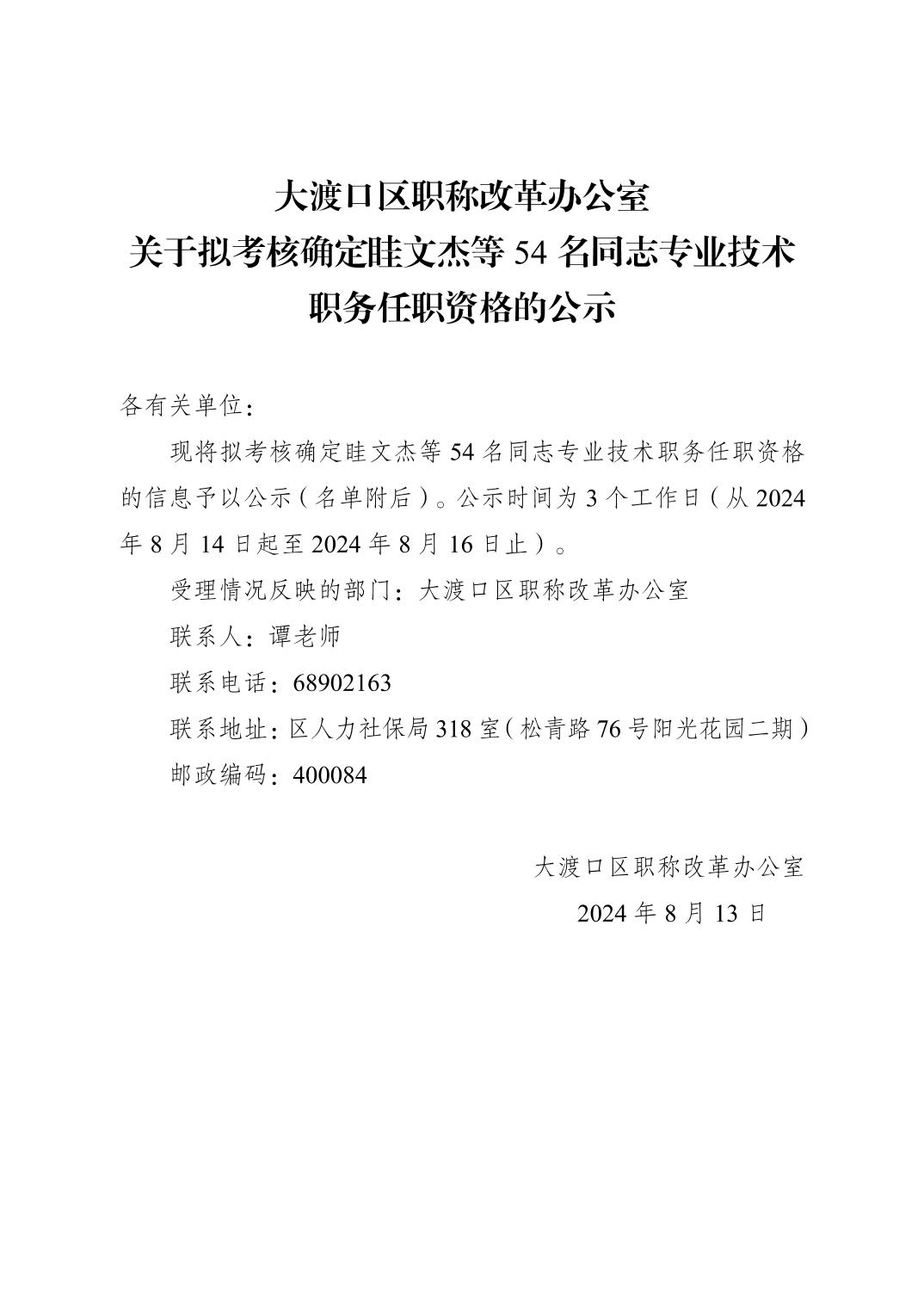 大渡口区职称改革办公室关于拟考核确定眭文杰等54名同志专业技术职务任职资格的公示
