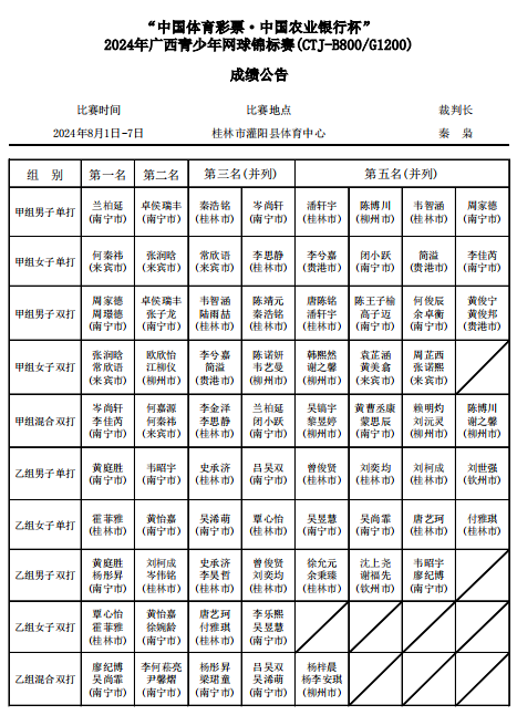 经过激烈的角逐,“中国体育彩票·中国农业银行杯”2024年广西青少年网球锦标赛单项比赛名次均已决出。