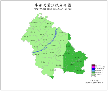 2024年8月16日16时至8月17日16时我县多云有阵雨、局地伴有雷电、大风。最大降雨量为109.3mm(虎威)。虎威、社坛、三建、龙河出现7-8级大风,极大风速18.8米/秒(三建,17日15时),最低气温15.3~25.1℃,最高气温22.4~39.8℃。丰都国家基本站雨量2.0mm,最低气温23.4℃,最高气温35.3℃。