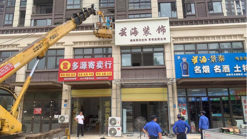 规范广告设置。执法人员加大户外广告设置的监管力度,确保施工现场封闭作业。8月13日,执法人员巡查至城区胜利北路张洪府邸小区段发现,一商家在吊机安装店招过程中,没有按规定设置施工围挡,对过往行人造成严重安全隐患。经查,该商家已办理相关审批手续,执法人员随即告知商家,公共区域安装门头店招应在其周围设置围挡封闭施工,确保施工安全。在执法队员的耐心细致的宣传教育下,当事人意识到问题的严重性,积极配合整改。截至目前,共规范门头店招设置行为20余处,确保了路人通行安全,构筑守护群众的第一道“安全防线”。